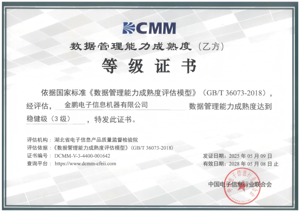 近日,金鵬電子信息機(jī)器有限公司通過了數(shù)據(jù)管理能力成熟度評(píng)估(Data Management Maturity Model,簡(jiǎn)稱DCMM),獲得DCMM穩(wěn)健級(jí)證書,標(biāo)志著公司在數(shù)據(jù)管理領(lǐng)域的綜合實(shí)力得到了國家級(jí)權(quán)威機(jī)構(gòu)的認(rèn)可。