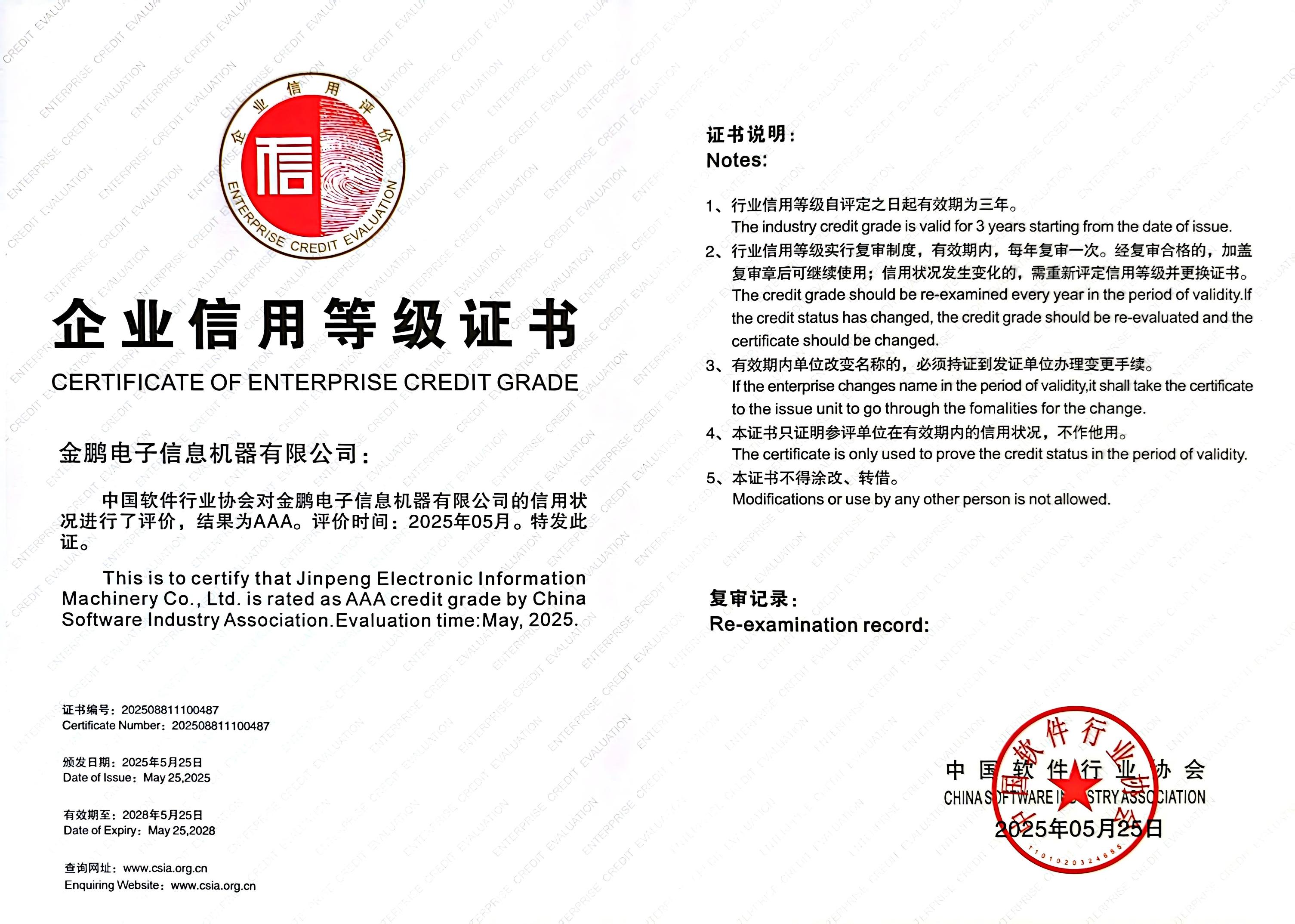 近日,金鵬電子信息機器有限公司通過中國軟件行業(yè)協會的嚴格審核與認證,再次榮獲“企業(yè)信用AAA等級”證書,這是企業(yè)信用最高等級證書。信用評價的內容主要包括:綜合素質、企業(yè)競爭力、經營狀況、管理能力、財務狀況、行業(yè)特征、信用記錄、供應商關系和客戶狀況等多個方面。
